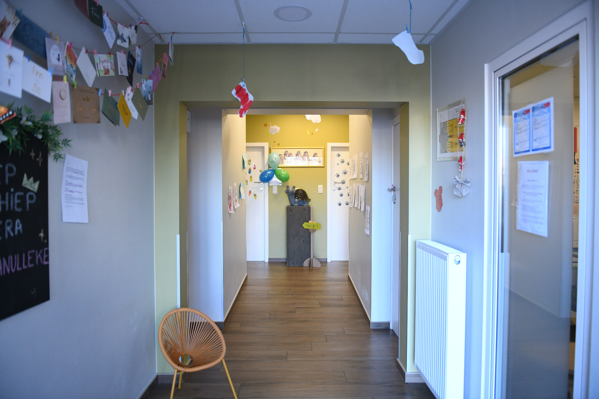 Een gezellige en uitnodigende gang waar onze kinderen hun dag vol plezier beginnen. Hier hangen creatieve kunstwerken en informatieve bordjes, die een warme en persoonlijke sfeer creëren.